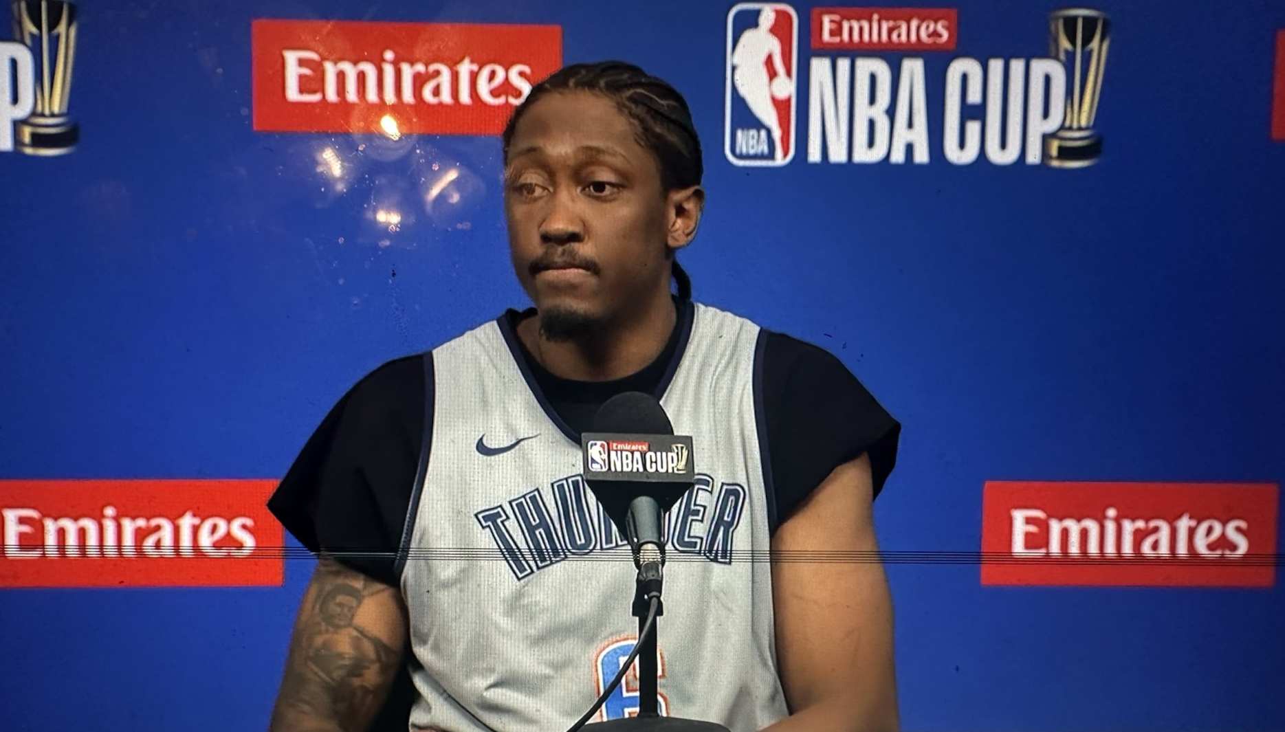 雷霆球员杰伦-威廉姆斯接受了记者采访。